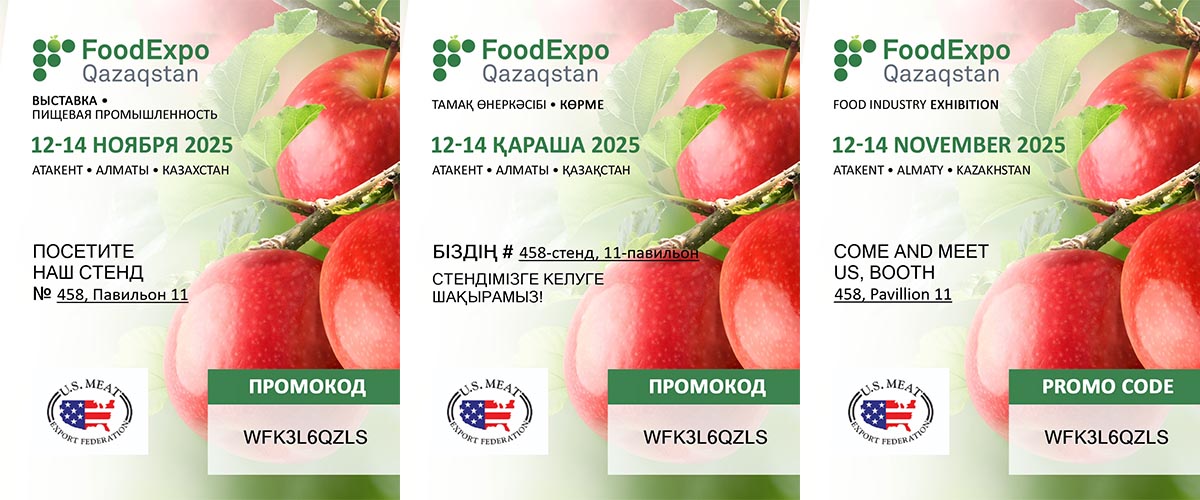We are inviting you to attend USMEF booth 458 in Pavillion 11 and meet with U.S. meat producers and exporters at FoodExpo Qazaqstan International Trade show that takes place at Atakent Exhibition Center, Almaty, on November 12-14, 2025.