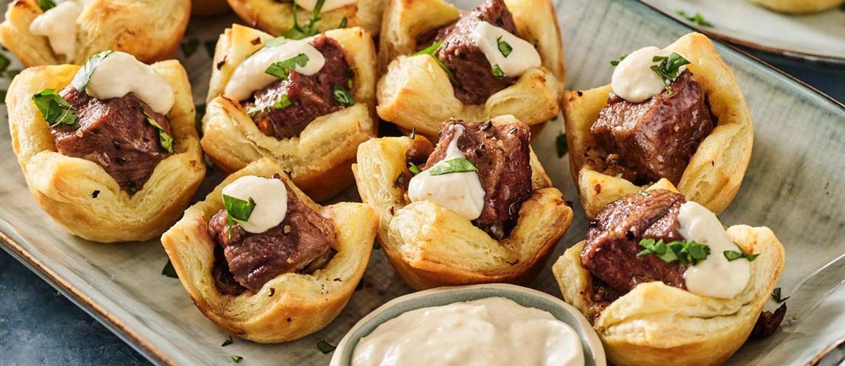 3. Spray 24 mini-muffin cups with cooking spray. Unfold puff pastry on a lightly floured cutting board; cut each sheet into 12 (2-inch) squares. Place squares into mini-muffin cups. Brush dough with mustard, then place heaping teaspoon of mushroom mixture in center of dough. Top with steak piece.