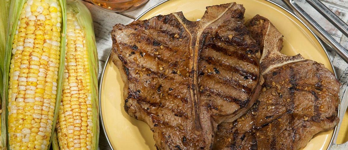 3. After 5 or 10 minutes, place beef T-Bone Steaks on grid with corn. Grill, covered, 11 to 16 minutes (over medium heat on preheated gas grill, 15 to 19 minutes) for medium rare (145°F) to medium (160°F) doneness, turning occasionally and brushing with glaze during last 5 minutes.