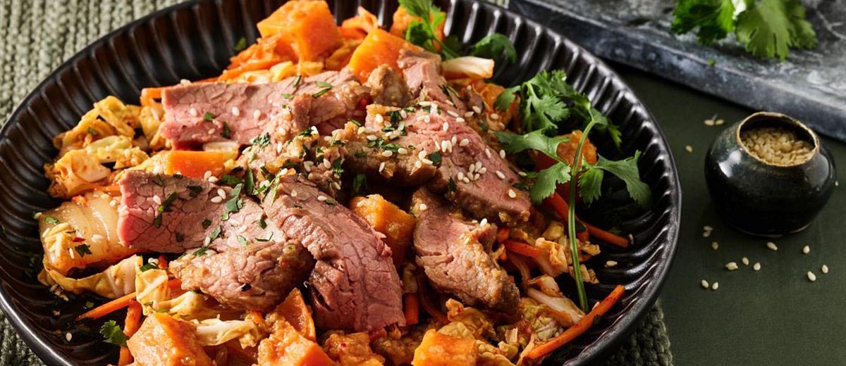 6. Переложите стейк, батат и половину соуса в большую миску и аккуратно перемешайте, чтобы всё покрылось соусом. Разложите по тарелкам вместе со капустным салатом Коул Слоу. По желанию посыпьте кинзой и кунжутом. Оставшийся соус подайте отдельно.