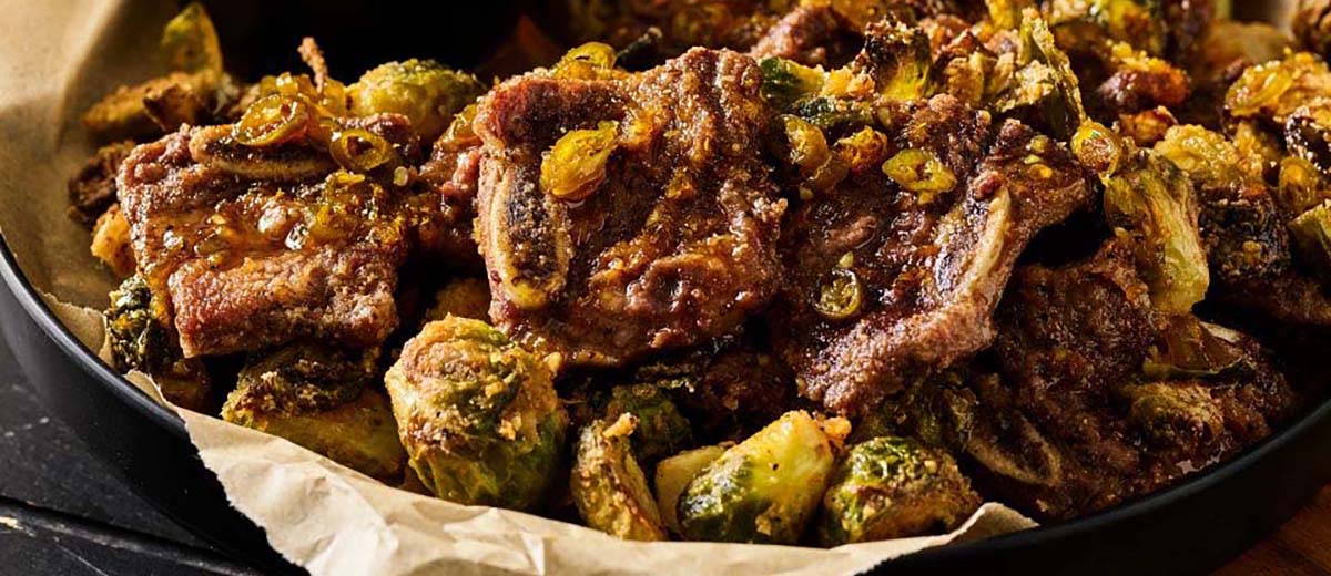 2. Смешайте кукурузный крахмал, муку, соль, перец и паприку в большой миске. Добавьте ребрышки и брюссельскую капусту, перемешайте до полного покрытия. Сбрызните оливковым маслом. Выложите в один слой в корзину для аэрогриля. Готовьте 10–15 минут, или пока они не подрумянятся, и не станут хрустящими, один раз перевернув.